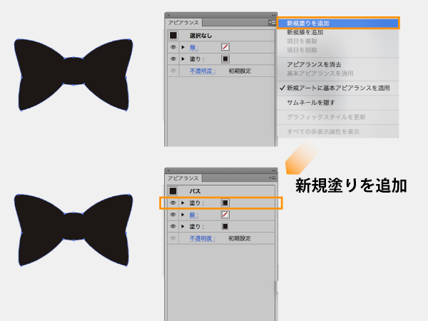 オブジェクトを選択したらアピアランスパネルの右上のメニューパネルより「新規塗りを追加」をクリックします。すると、見た目は変わりませんが黒い塗りがアピアランスパネルの一番上に追加されます。塗りが重なった状態になっています。