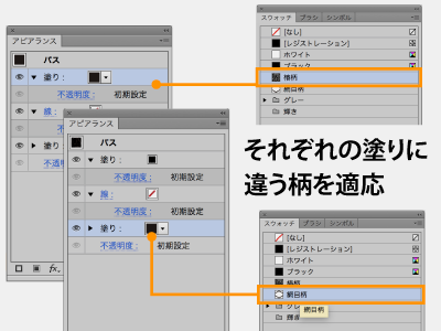 Illustratorのアピアランス機能はオブジェクトそのものにレイヤーのようなもの機能を持たせることができます。「塗り」「線」「効果」などを重ね、よく使うものはグラフィックスタイルに登録しておくと作業がはかどります。「塗り」パターンスウォッチを複数重ねることでより複雑で自分では考えつかないような柄を表現することも可能です。