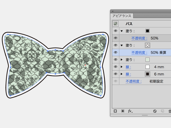 上記の方法でできできたものを参考に色を増やしたり「透明」を使ってみたりするといろんな柄ができます。「線」も設定できるので、グループ化をせずに一つオブジェクトで編集することができます。アピアランスは使い方次第でかなり作業効率アップが期待出来る機能です。