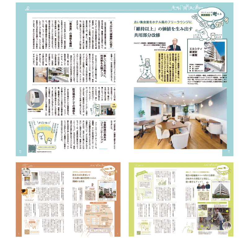 「資産価値を考える」というページをリニューアルする際に、もっと利用者が楽しんでいることが伝わる紙面にしたほうが良いと考え、キャラクターを作成し、イラストや図で明るく変更。クライアントの評判も上々。